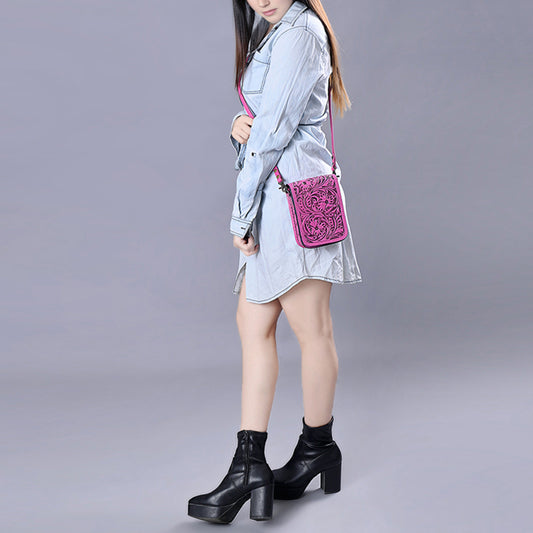 ADBG1136 American Darling Pink Hand Tooled Floral Leather Crossbody Bag Western Purse