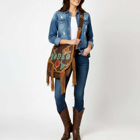 ADBGM351 Western Rodeo Leather Messenger Bag with Fringe & Tooled Motifs - Cowgirl Messenger Saddle Purse