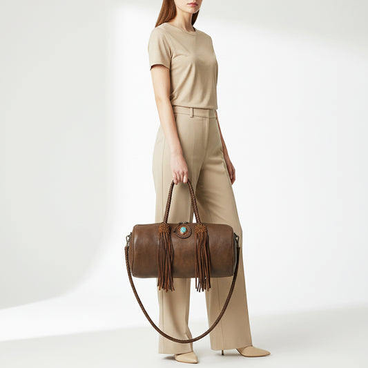 ADBGM356 Western Barrel Duffel Bag in Brown Leather with Turquoise Concho & Fringe - Handmade Travel Tote