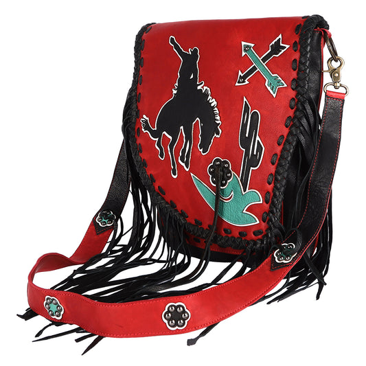 ADBGM352 Red Western Rodeo Leather Messenger Bag with Fringe & Applique- Cowgirl Statement Messenger