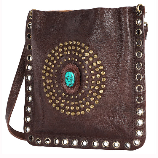 ADBGM353 Leather Crossbody Bag with Studded Circle & Turquoise Concho - Western Grommet Shoulder Purse
