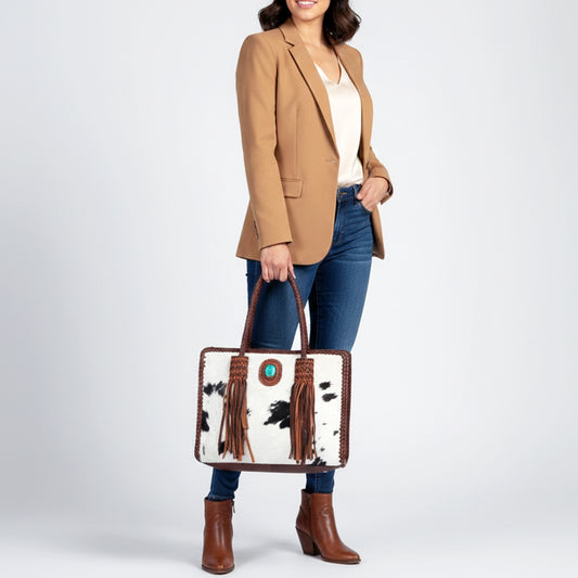 ADBGM348 Leather Tote Bag with Turquoise Concho & Fringe - Handmade Western Braided Strap Purse
