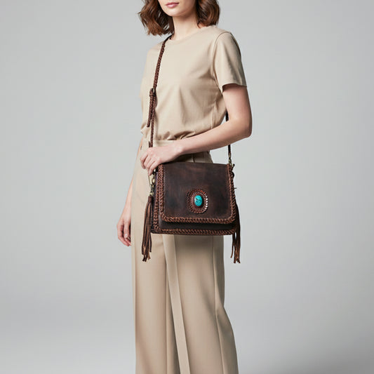 ADBGM346 Dark Brown Leather Crossbody Bag with Turquoise Concho - Handmade Western Braided Flap Purse
