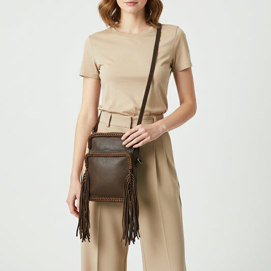 ADBGM354 Leather Fringe Crossbody Bag - Dual Pocket Western Braided Mini Purse