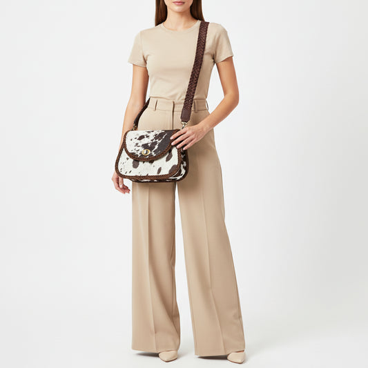 ADBGM465 Hair-On Cowhide Leather Crossbody - Western V-Flap Bag with Braided Trim & Handle