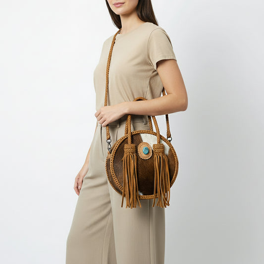 ADBGM466 Round Cowhide Leather Canteen Fringe Bag - Western Turquoise Concho & Braided Strap