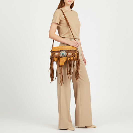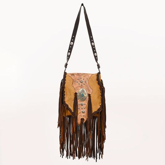 ADBGM472 Western Boho Leather Fringe Messenger Bag - Distressed Flap with Hand-Laced Detailing