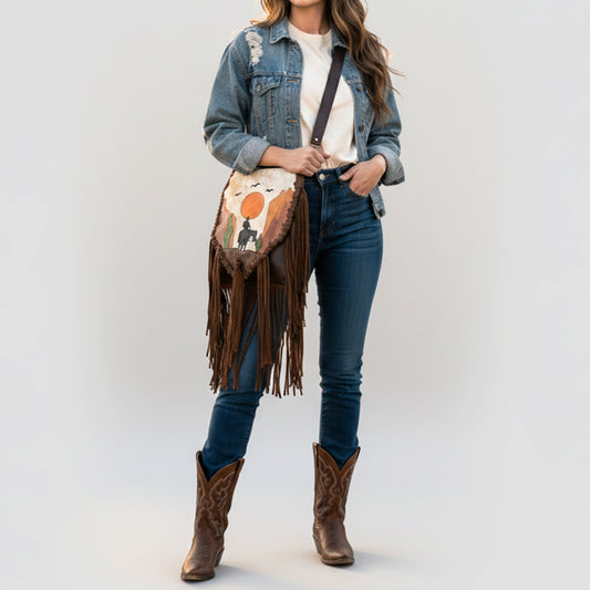ADBGM554 Cowhide Crossbody Bag with Desert Riders Scene - Western Fringe Leather Purse