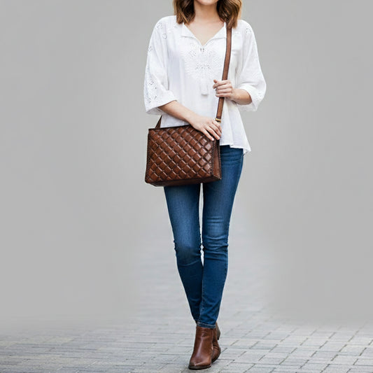ADBGM542 Western Quilted Leather Tote Bag - Structured Cowgirl Handbag with Diamond Stitch Patch