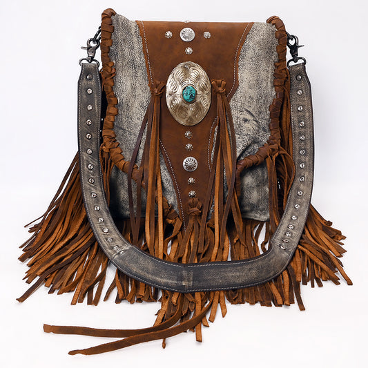 ADBGM555 Western Leather Fringe Messenger Bag - Cowhide Purse with Turquoise Concho & Studded Strap