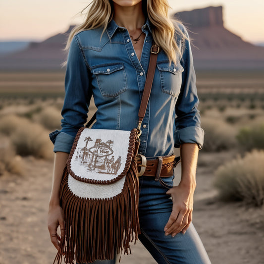 ADBGM602 Las Vegas Cowboy Scene Hair-On Hide Fringe Crossbody Bag - Western Leather Purse