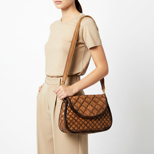 ADBGM741 Quilted Leather Messenger Handbag - Western Tan Structured Purse with Gold Chain & Tassel