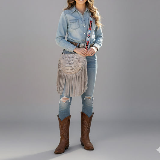 ADBG1168 American Darling Crocodile Embossed Fringe Crossbody | Western Beaded Strap Bag