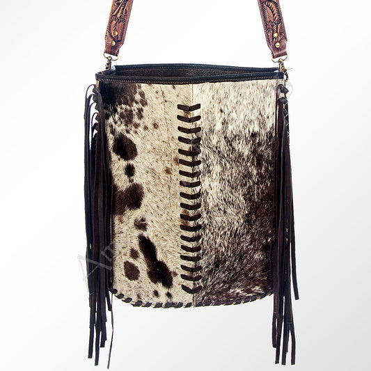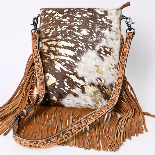 ADBGS192 Splatter Cowhide Large Crossbody Bag with Fringe & Tooled Leather Strap