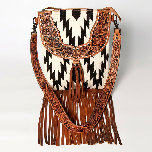 ADBGZ104 Southwestern Woven Crossbody Bag with Tooled Leather & Fringe
