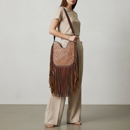ADBGZ473 Hand-Tooled Leather Western Fringe Hobo Bag - Floral Saddle Design