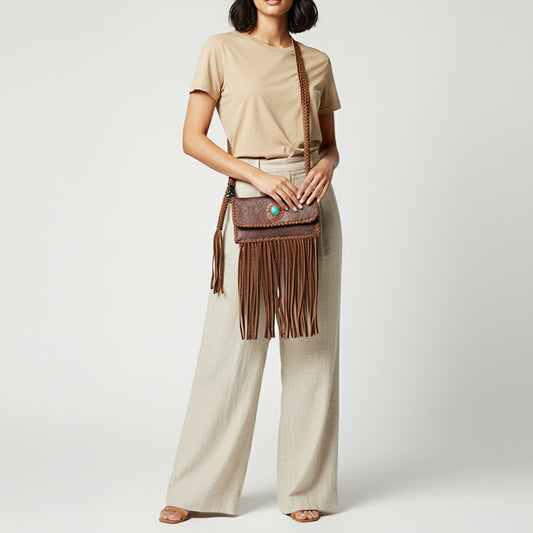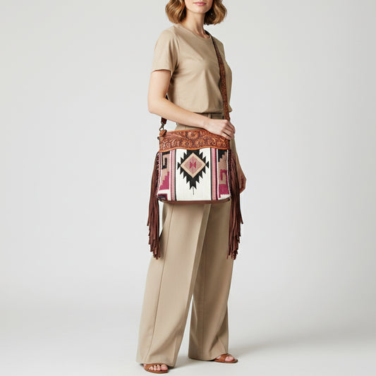 ADBGZ365 Tooled Leather & Tribal Wool Crossbody Bag - Western Fringe Shoulder Purse