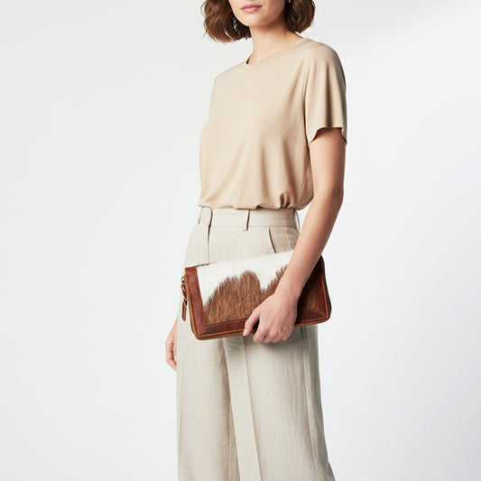 ADBGZ335 Black & White Cowhide Wristlet - Hair-On Hide Clutch with Tooled Leather Detail