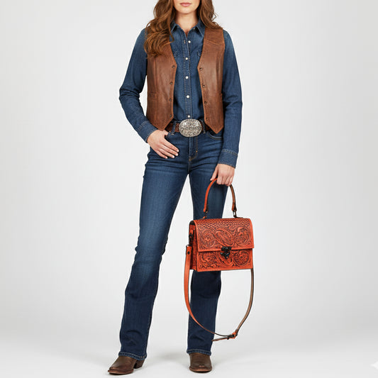 ADBGZ868 Hand-Tooled Tan Leather Structured Messenger Bag Western Floral Purse | American Darling