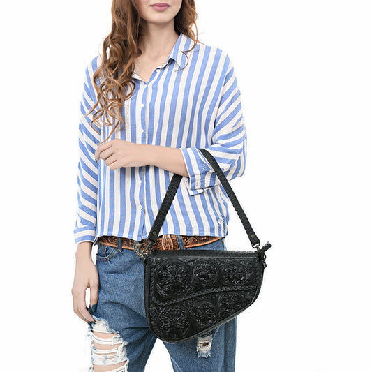 ADBGZ904A Black Hand-Tooled Genuine Leather Curved Messenger Bag with Chain Strap