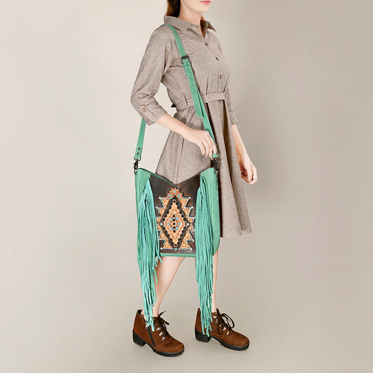 ADBG1199 American Darling Western Hand Tooled Leather Fringe Crossbody Bag