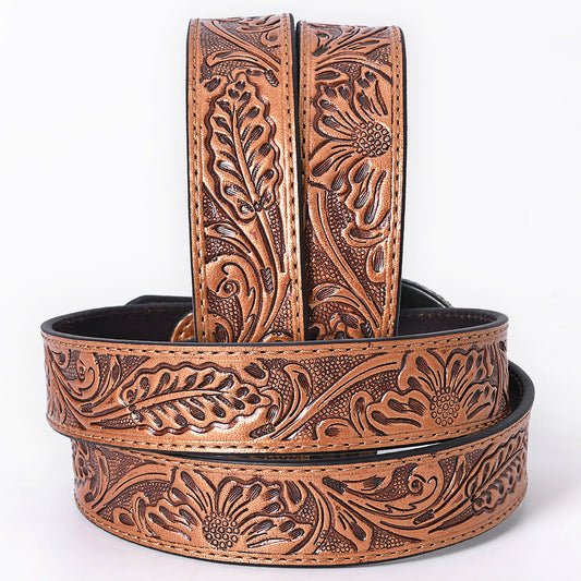 ADBL174 Hand-Tooled Copper Brown Western Leather Belt with Floral Oval Buckle