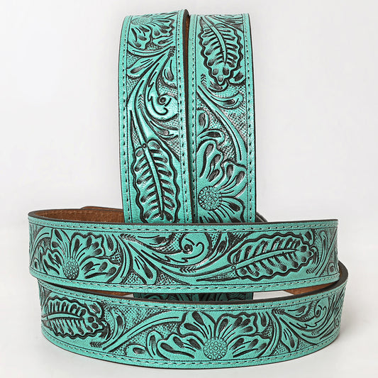 ADBL175 Hand-Tooled Turquoise Floral Western Leather Belt with Oval Buckle