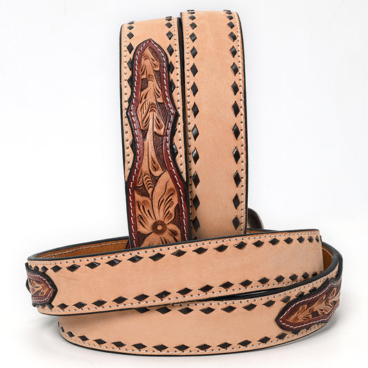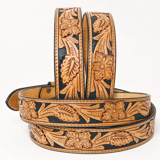 ADBLF238 Two-Tone Tooled Leather Belt with Whipstitch Edge and Matching Buckle