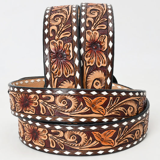 ADBLF223 Natural Tooled Leather Western Belt with Diamond Cutouts and Silver Buckle