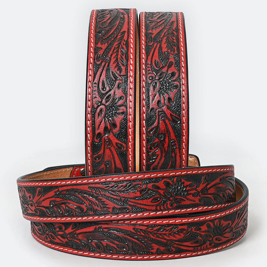 ADBLF216 Red & Black Hand-Tooled Leather Belt with Matching Floral Buckle