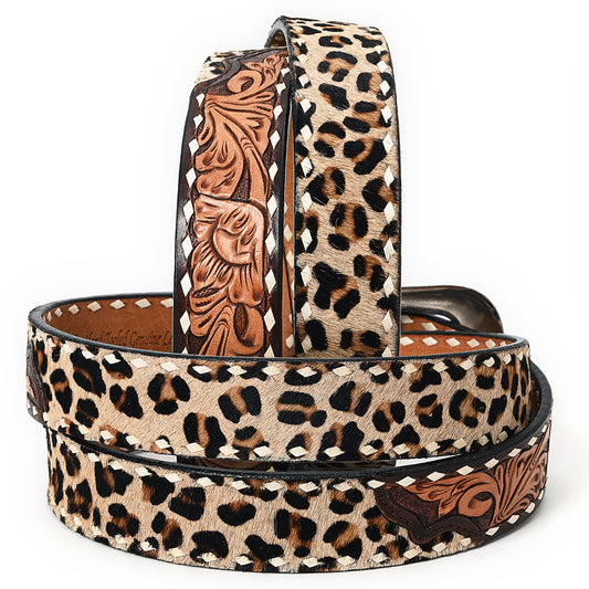 ADBLF227 Leopard Print Hair-On & Tooled Leather Western Belt with Engraved Buckle