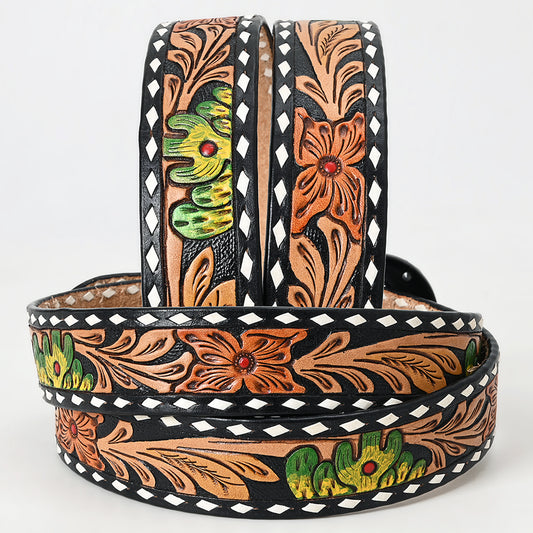 ADBLF225 Black & Tan Hand Tooled Leather Western Belt with Silver Buckle
