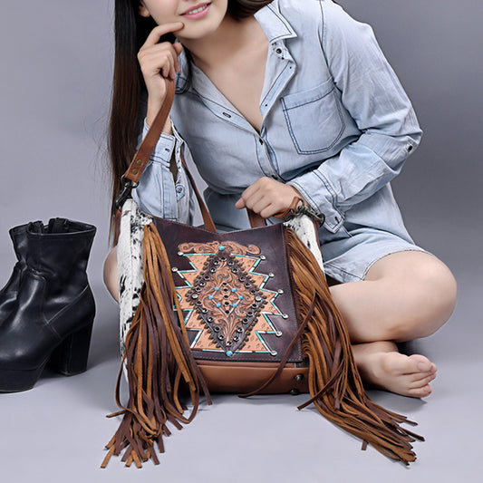 ADBG1219 American Darling Hand-Tooled Hair-On Cowhide Western Leather Fringe Crossbody Bag