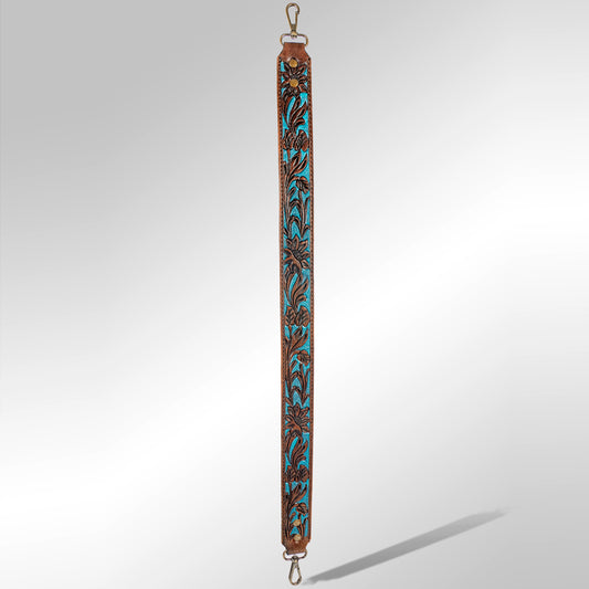 ADBT106 Tooled Leather Bag Strap - Turquoise Blue with Floral Design