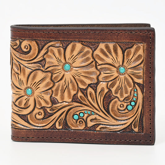 ADCCG104 Hand-Tooled Bi-Fold Leather Wallet - Turquoise Floral Design