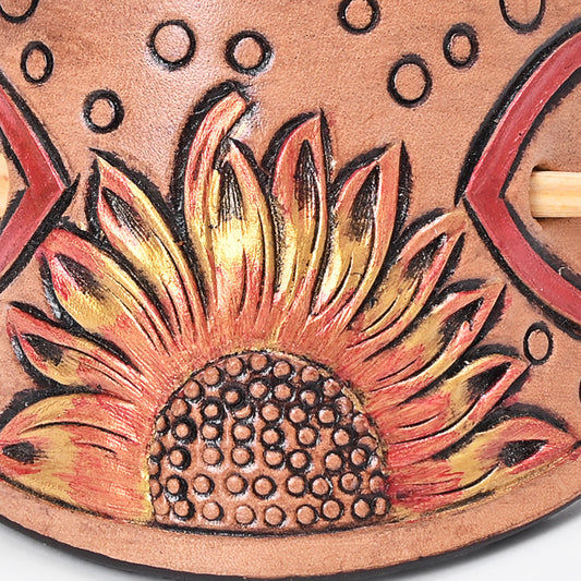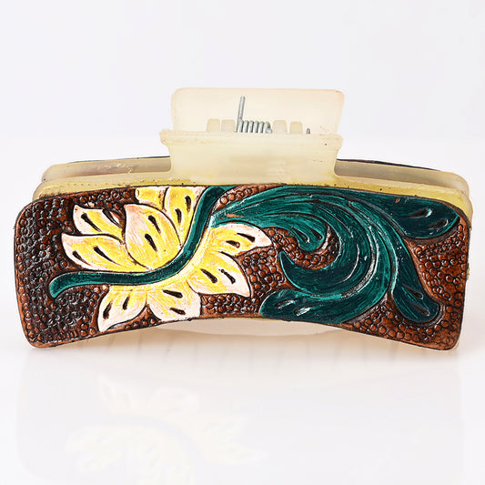ADHC146 Western Hand-Tooled Leather Hair Band Clip Clutcher with Yellow Flower & Green Scroll