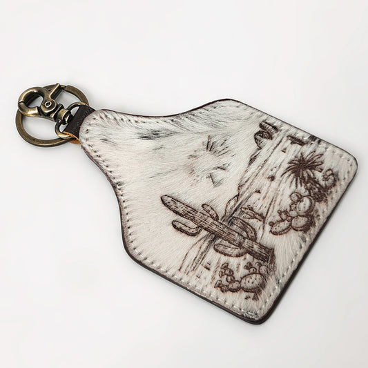 ADKRM139 Western Desert Scene Cowhide Leather Keychain Hand-Tooled Cactus Landscape