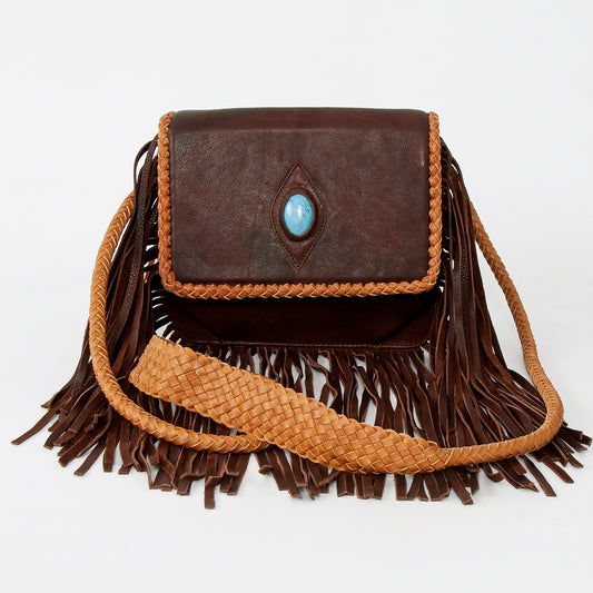 LC-ADBGD128B Brown Leather Tote Bag with Turquoise Concho & Braided Fringe Handles
