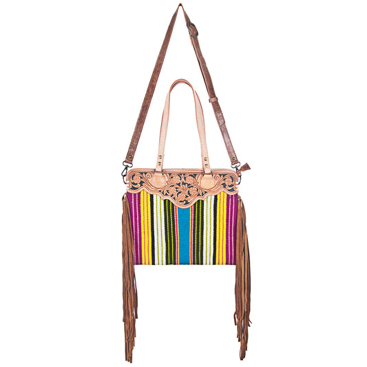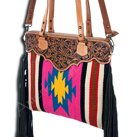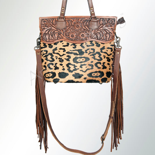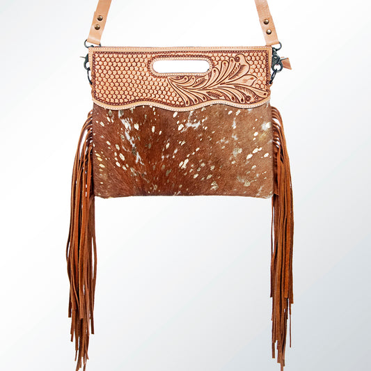 LC-ADBGS144BRW Tooled Leather & Cowhide Messenger - Western Fringe Bag with Floral Carving