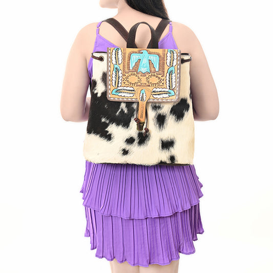 LC-ADBGZ101 Tooled Leather Flap Cowhide Backpack - Black & White Hair-On Hide Western Bag