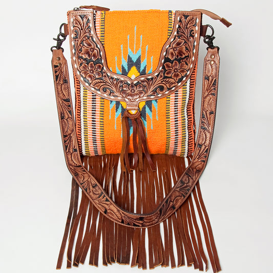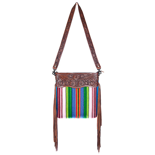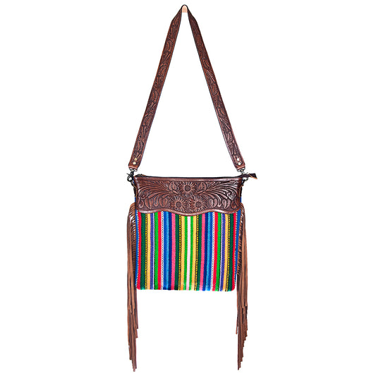 LC-ADBGZ112 Brown Leather Crossbody Bag with Floral Tooled Strap & Fringe