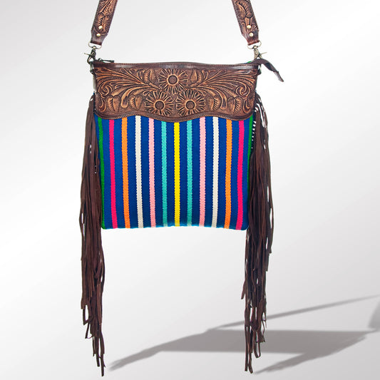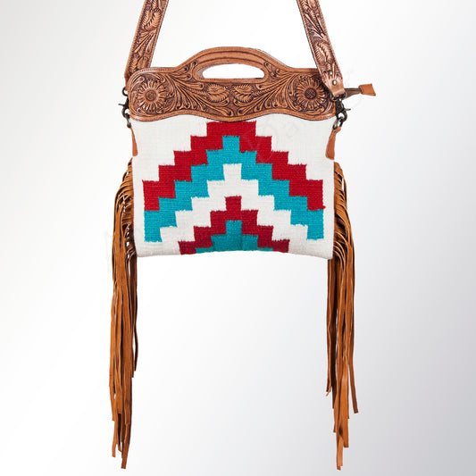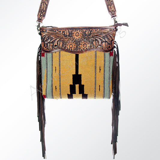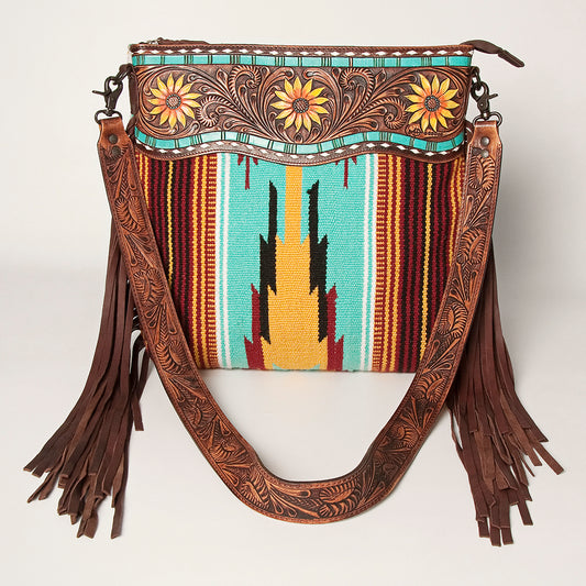 LC-ADBGZ236 Sunflower Tooled Leather & Turquoise Wool Western Fringe Crossbody Bag