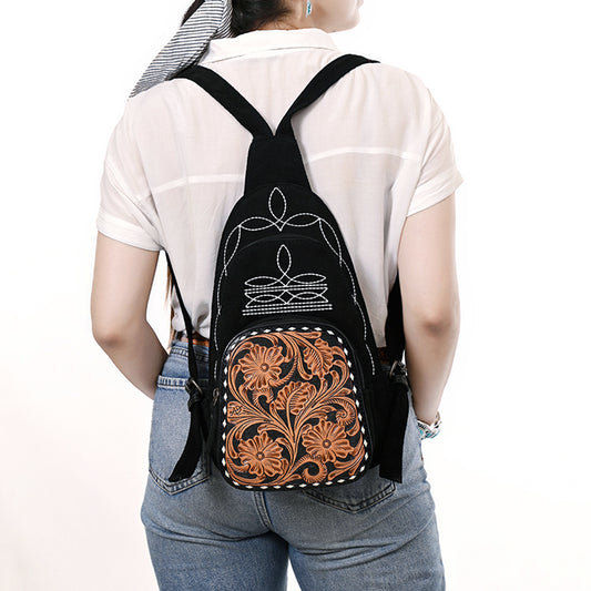 ADBG1574 American Darling Black Suede Genuine Leather Backpack Bag with Hand Tooled Floral Front & Buck Stitch Accents