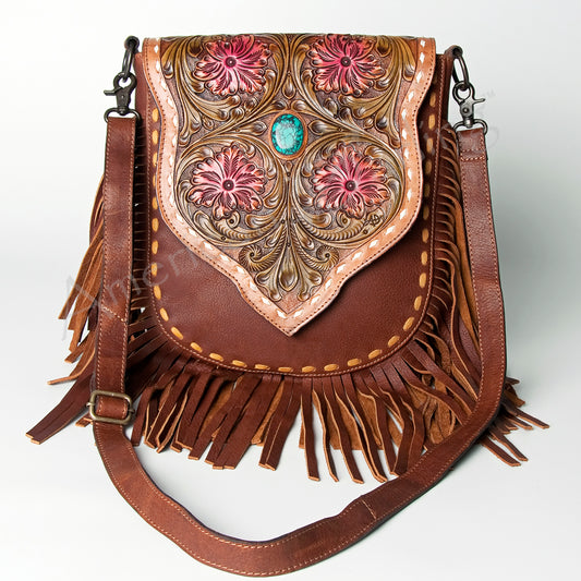 LC-ADBGZ474 Hand-Tooled Leather Fringe Messenger Bag - Floral Carving with Turquoise Accent