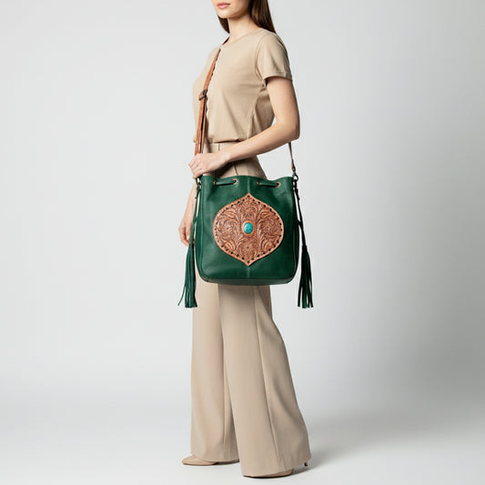 LC-ADBGZ477 Emerald Green Leather Bucket Bag with Hand-Tooled Floral Patch & Turquoise Accent
