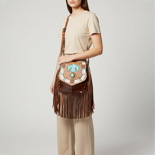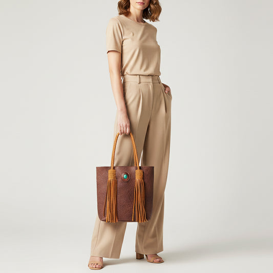 LC-ADBGZ497A Brown Leather Western Tote Bag - Braided Fringe Handles with Turquoise Accent