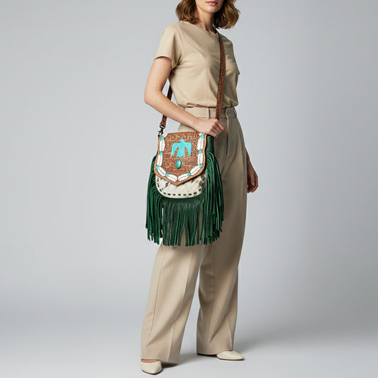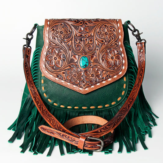 LC-ADBGZ479 Green Leather Western Fringe Messenger Bag - Hand-Tooled Floral Flap with Turquoise Accent