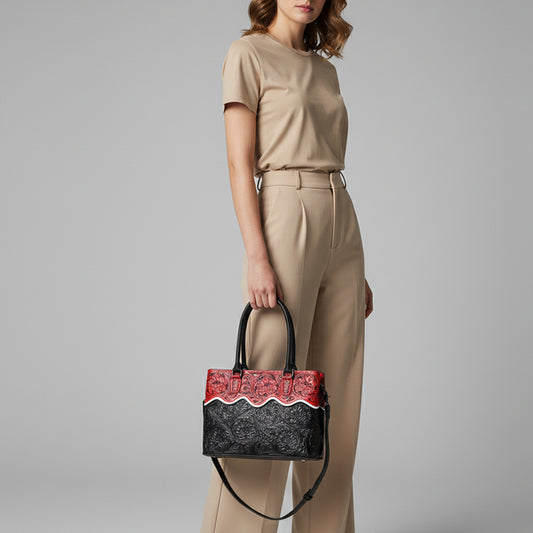ADBG1598 Handtooled Black & Red Leather Tote with Floral Carving and Shoulder Strap