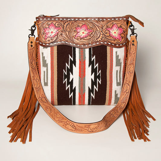 LC-ADBGZ641A Western Leather Crossbody Bag with Tooled Yoke & Turquoise Wool Pattern