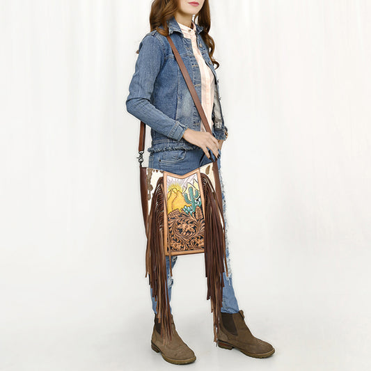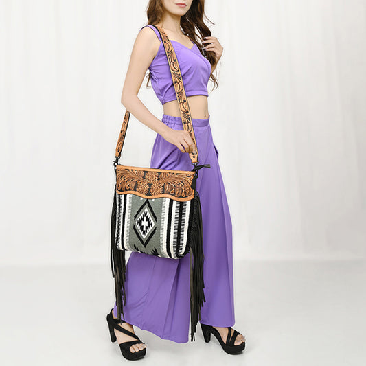 LC-ADBGZ680 Western Hand-Tooled Leather Crossbody Bag with Fringe and Aztec Wool Pattern